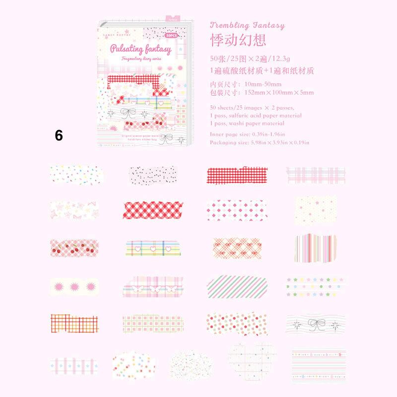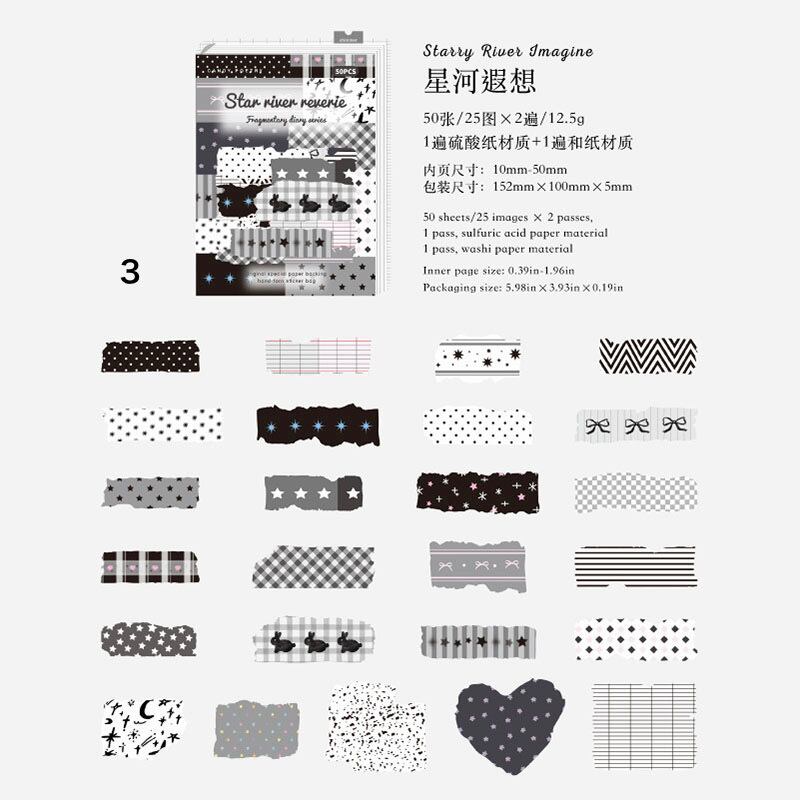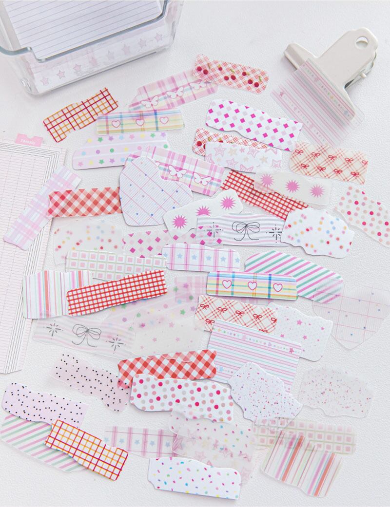 マステ素材とトレペ素材両方入っていて、50枚という大容量です。手帳にもコラージュにも封緘シールにも、ラベルにも、様々な用途でお使いいただけると思います♪