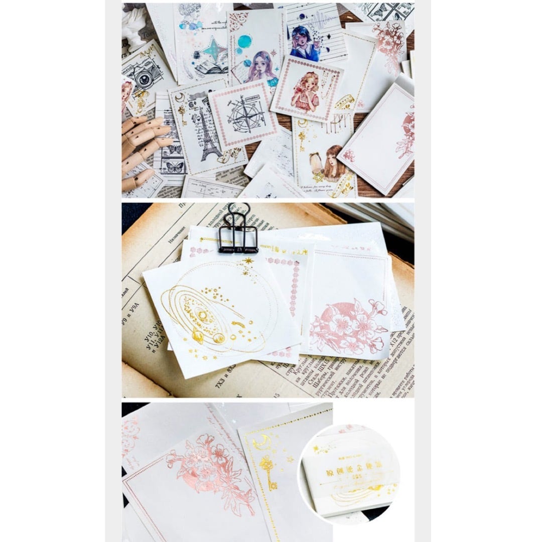 キラキラ箔押しのメモです。箔押しはシルバー、ゴールド、ピンクゴールドの3色あり、柄は5種類あります。