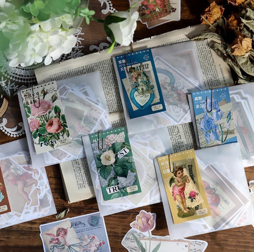 洋書の絵柄にアンティークなお花や天使をあしらった、コラージュ風のシールです。手帳やコラージュに貼ると一気に映えますね♪