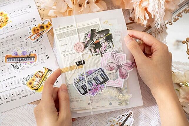 店主の大好きなお花と音楽が組み合わさったシールです。春はつややかな音楽が聴きたくなりますね♪天気のいい日のコラージュなどにいかがでしょうか♪