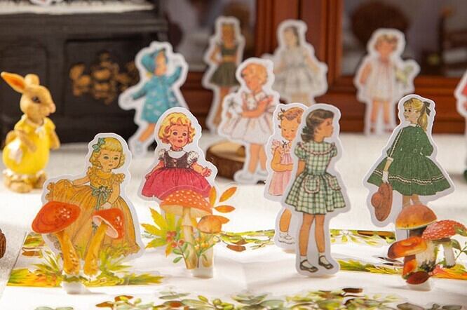 レトロな可愛い女の子のシールです。お人形みたいでとても可愛いです。アンティークなコラージュにピッタリですね♪