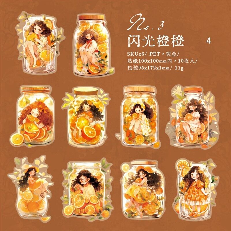 夏の爽やかなフルーツを瓶に閉じ込めたシールです。女の子の絵もとても可愛いです。オーロラのキラキラした箔押しが夏のまぶしい太陽を思わされます。日記などにいかがでしょうか♪